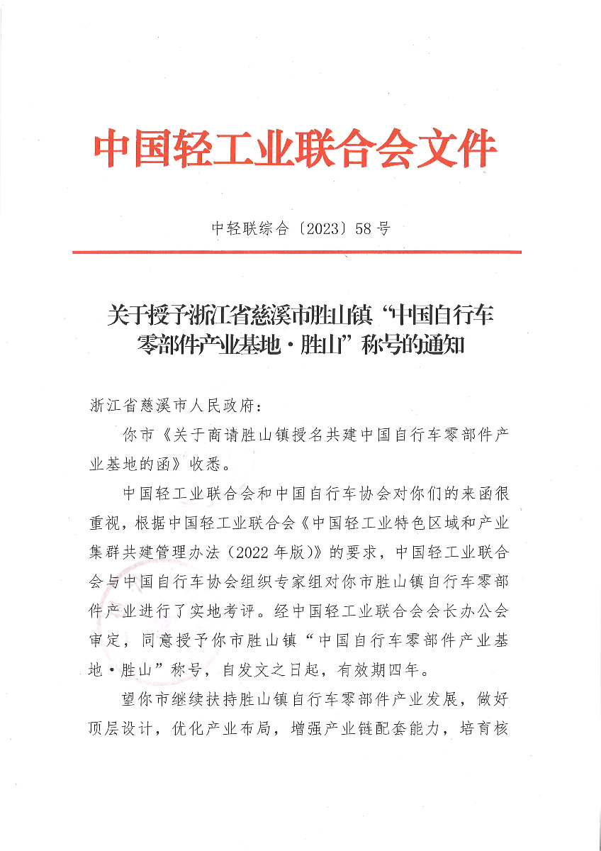 關于授予浙江省慈溪市勝山鎮(zhèn)“中國自行車零部件產(chǎn)業(yè)基地·勝山”稱號的通知