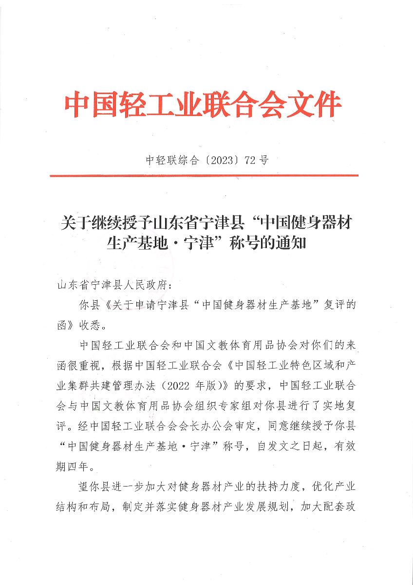 關于繼續(xù)授予山東省寧津縣“中國健身器材生產基地·寧津”稱號的通知