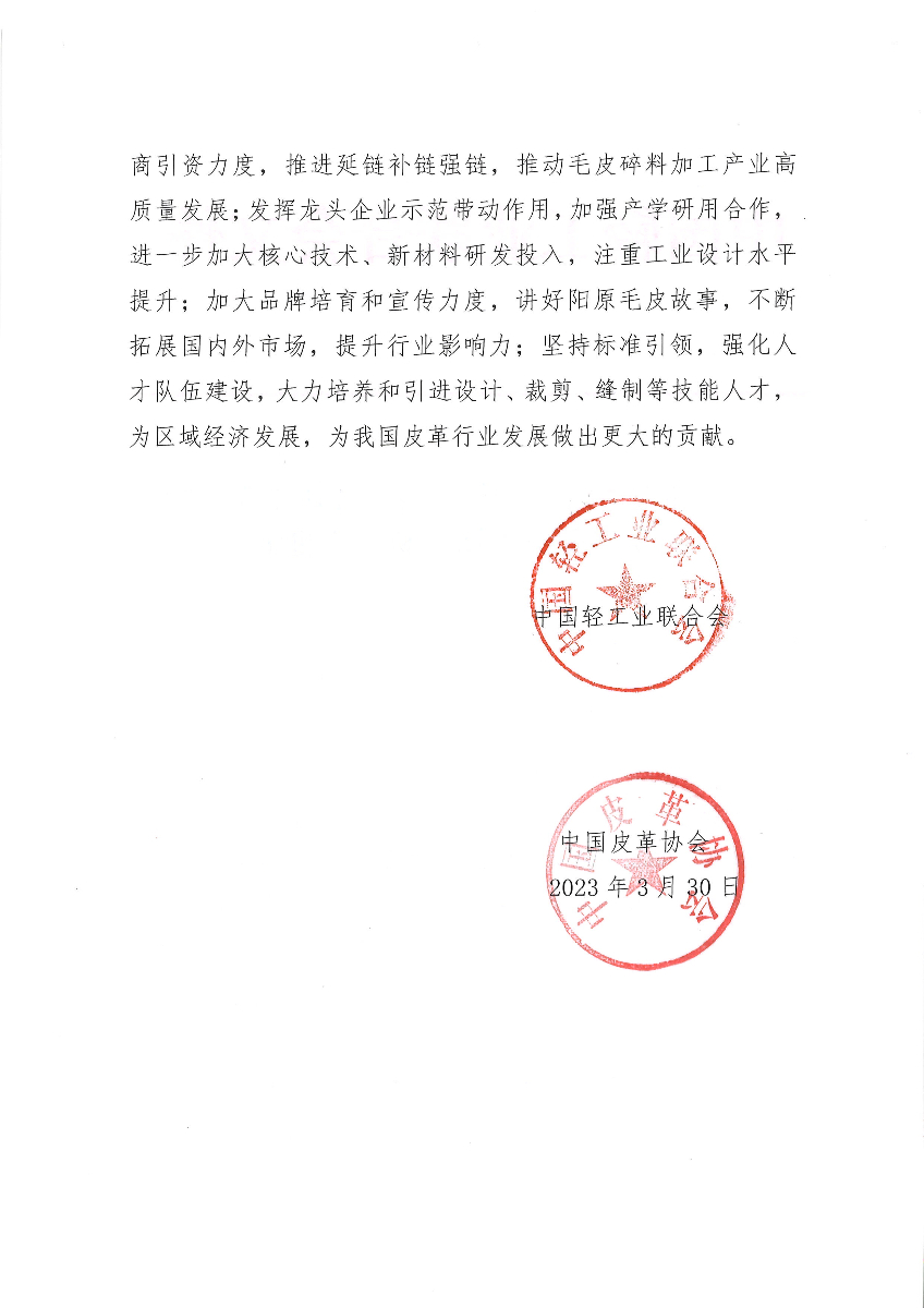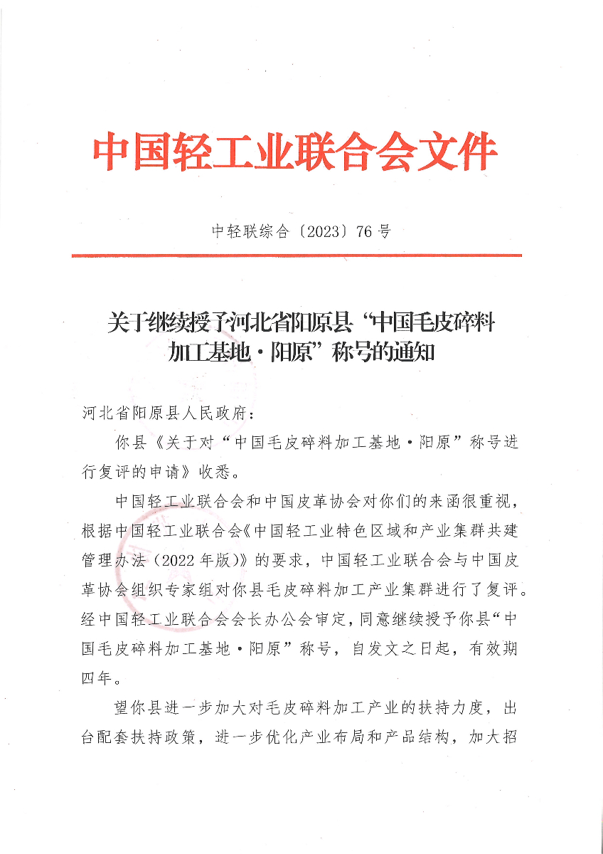 關(guān)于繼續(xù)授予河北省陽原縣“中國毛皮碎料加工基地·陽原”稱號(hào)的通知