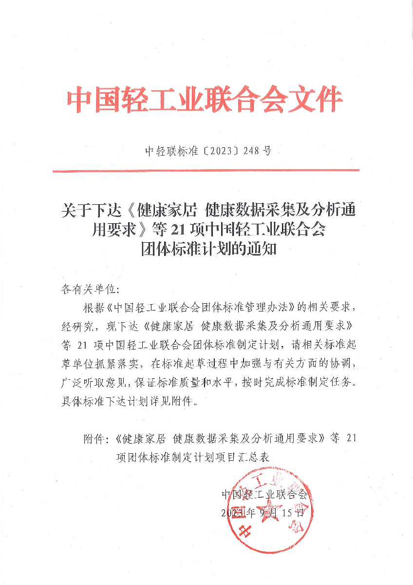關(guān)于下達(dá)《健康家居 健康數(shù)據(jù)采集及分析通用條件》等21項(xiàng)中國輕工業(yè)聯(lián)合會團(tuán)體標(biāo)準(zhǔn)計(jì)劃的通知