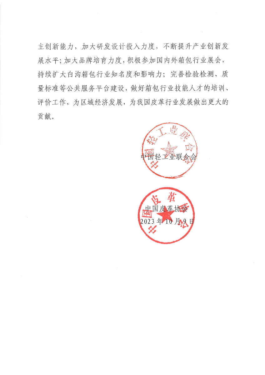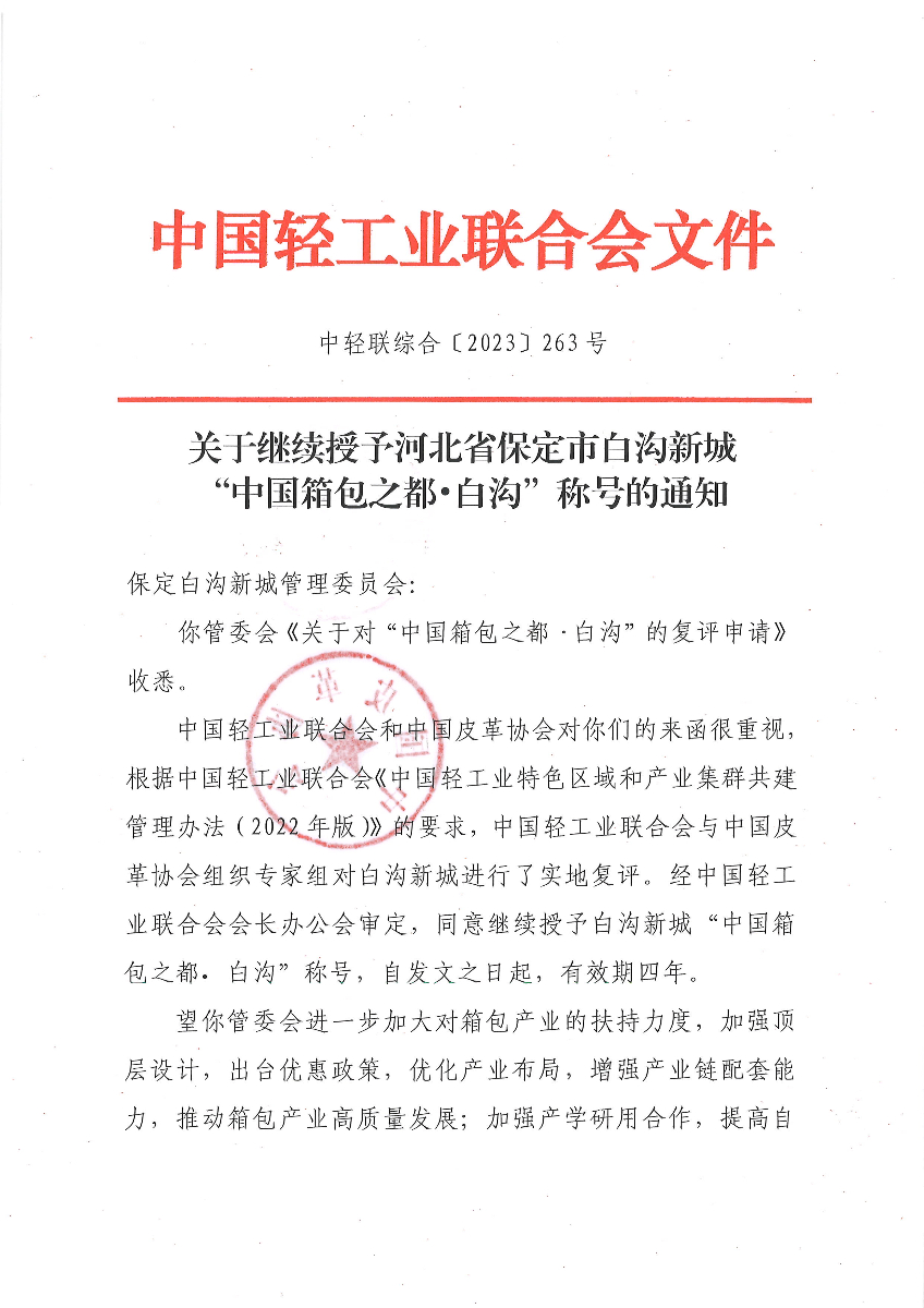 關(guān)于繼續(xù)授予河北省保定市白溝新城“中國箱包之都·白溝”稱號的通知