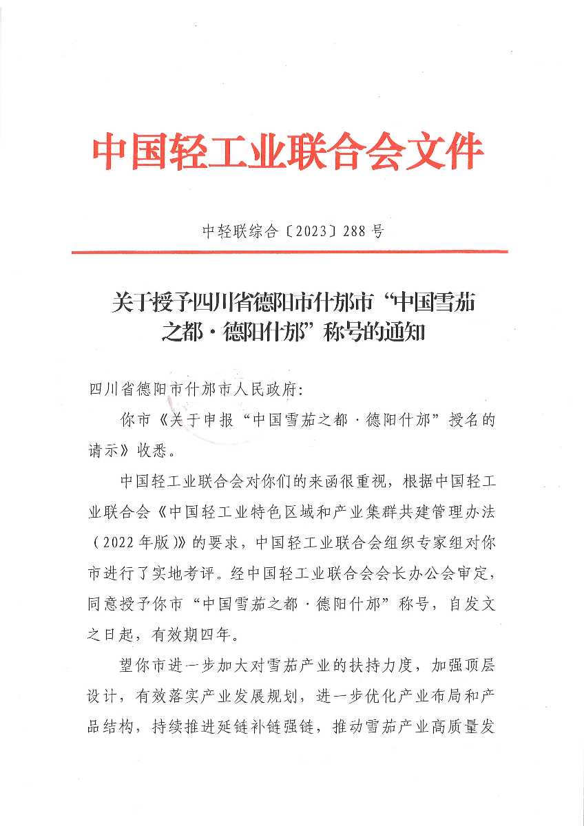 關(guān)于授予四川省德陽市什邡市“中國雪茄之都·德陽什邡”稱號的通知