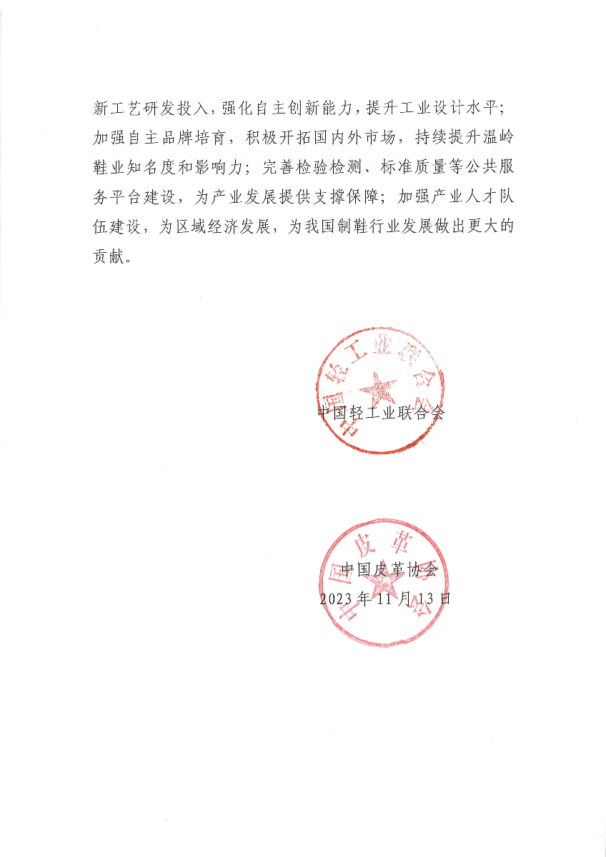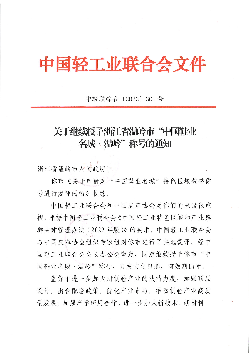 關(guān)于繼續(xù)授予浙江省溫嶺市“中國鞋業(yè)名城·溫嶺”稱號的通知