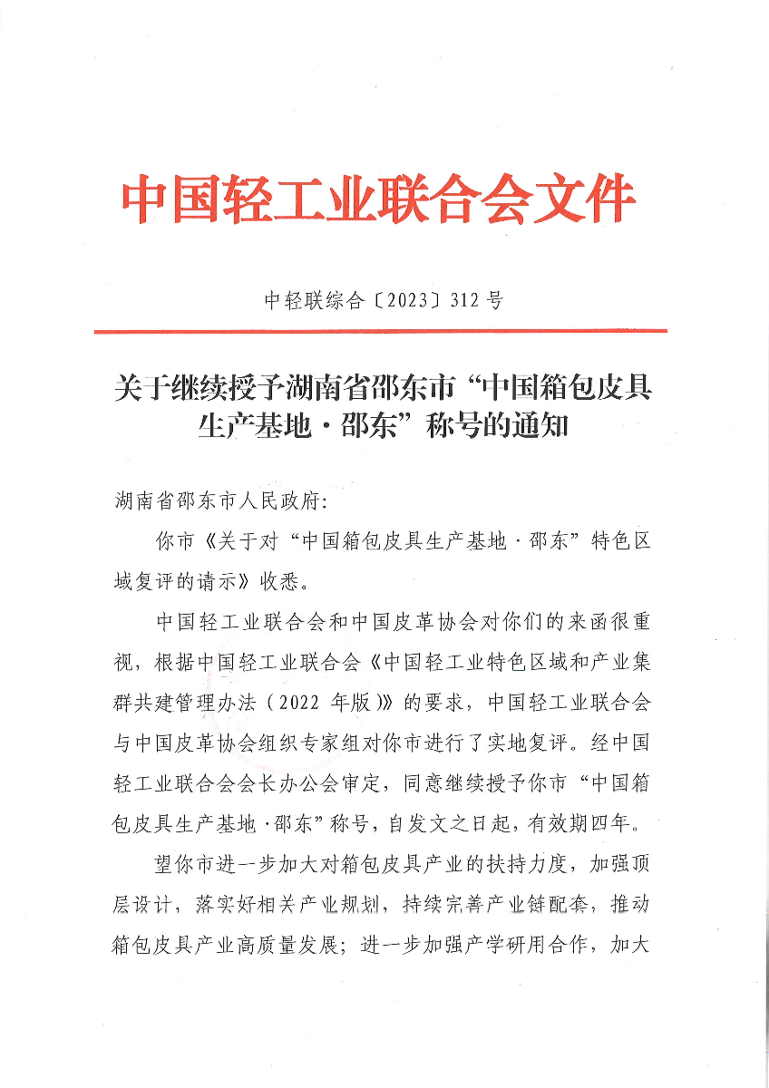 關于繼續(xù)授予湖南省邵東市“中國箱包皮具生產基地·邵東”稱號的通知