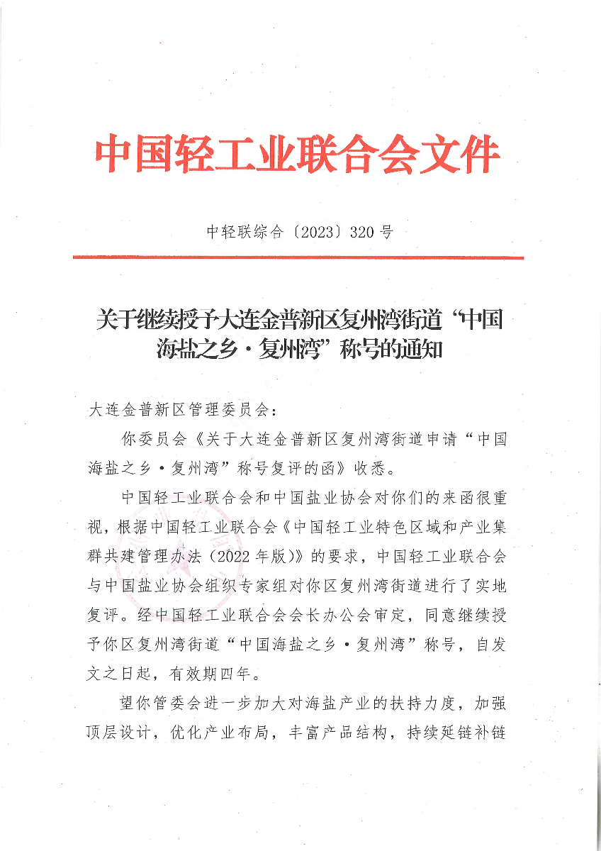 關(guān)于繼續(xù)授予大連金普新區(qū)復州灣街道“中國海鹽之鄉(xiāng)·復洲灣”稱號的通知