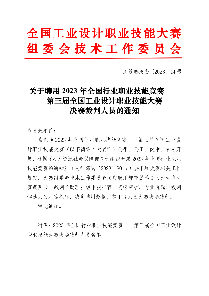 關(guān)于聘用第三屆全國工業(yè)設計職業(yè)技能大賽決賽裁判人員的通知.pdf