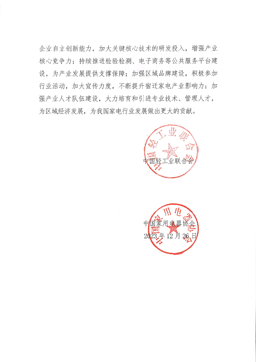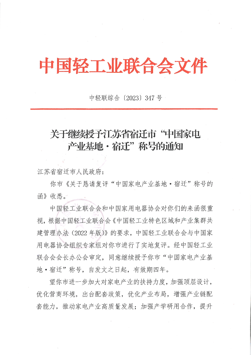 關(guān)于繼續(xù)授予江蘇省宿遷市“中國家電產(chǎn)業(yè)基地·宿遷”稱號的通知