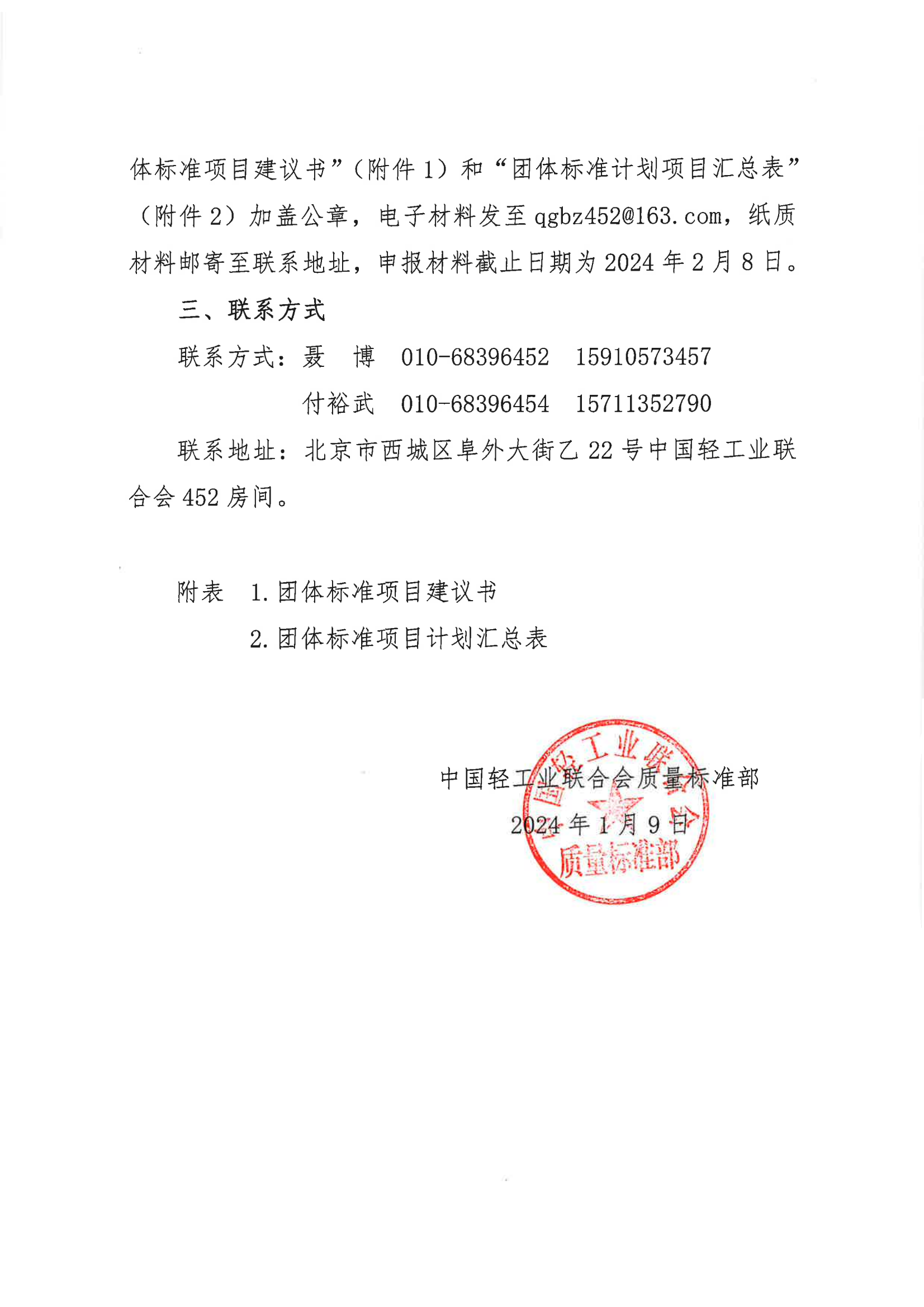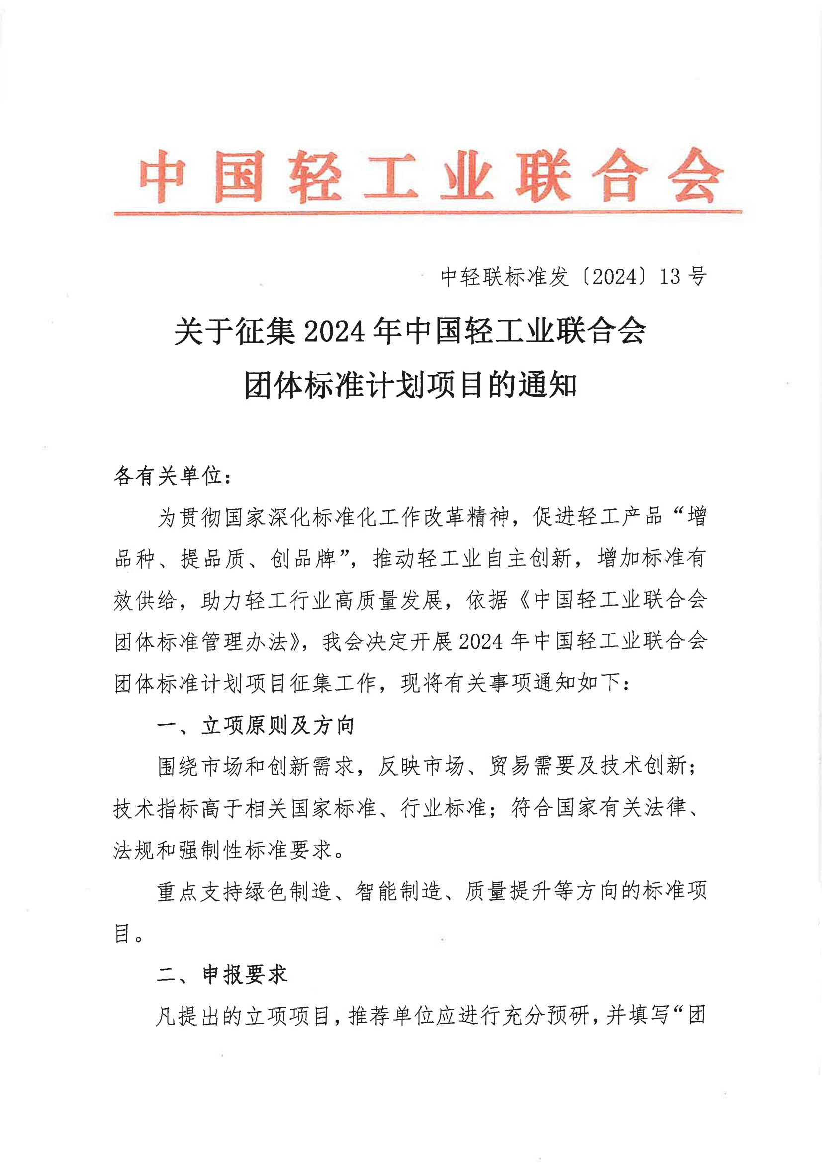 關(guān)于征集2024年中國(guó)輕工業(yè)聯(lián)合會(huì)團(tuán)體標(biāo)準(zhǔn)計(jì)劃項(xiàng)目的通知