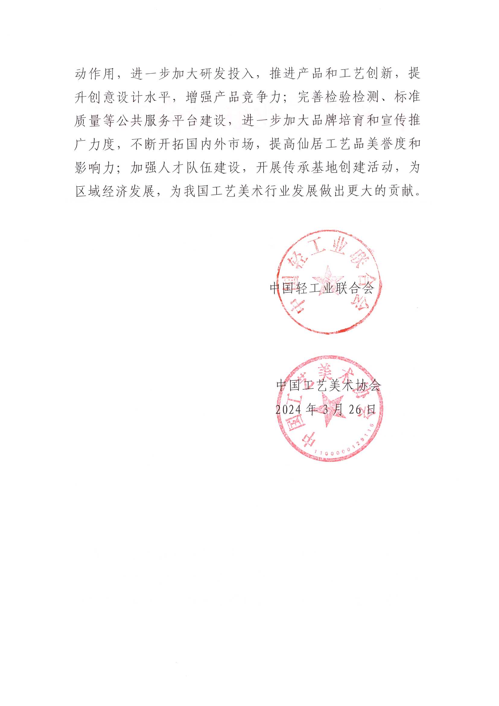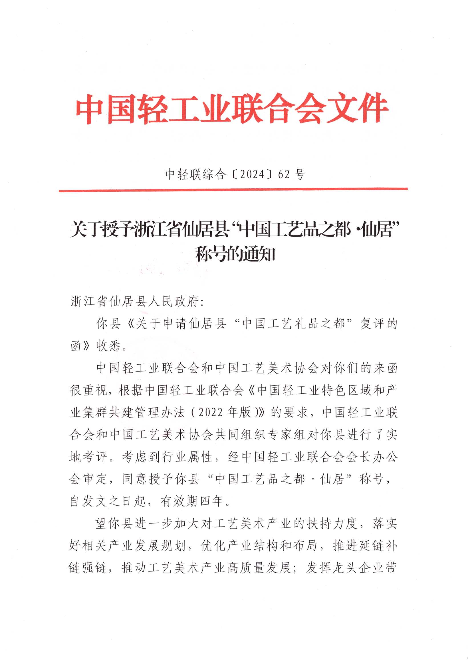 關于授予浙江省仙居縣“中國工藝品之都·仙居”稱號的通知