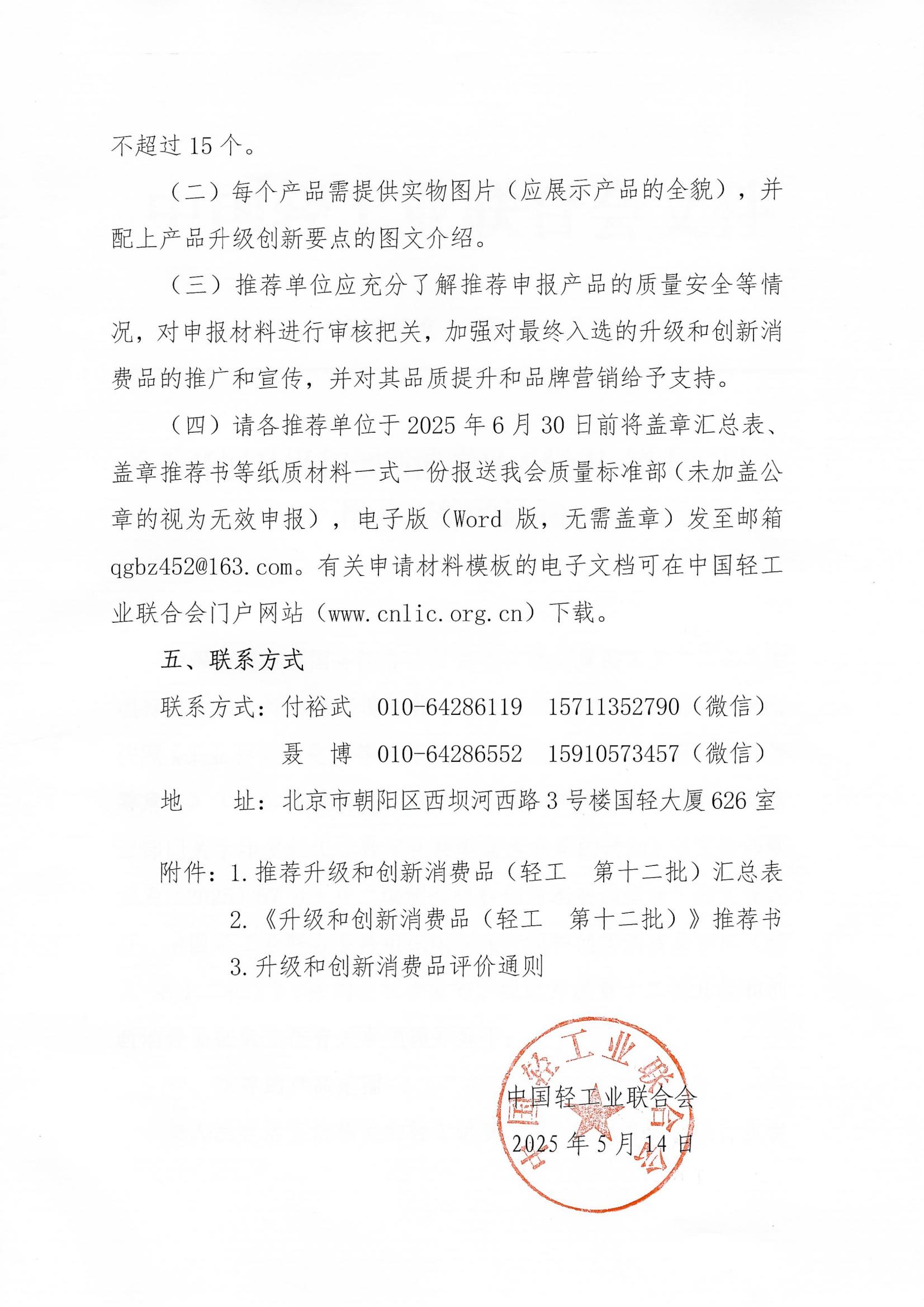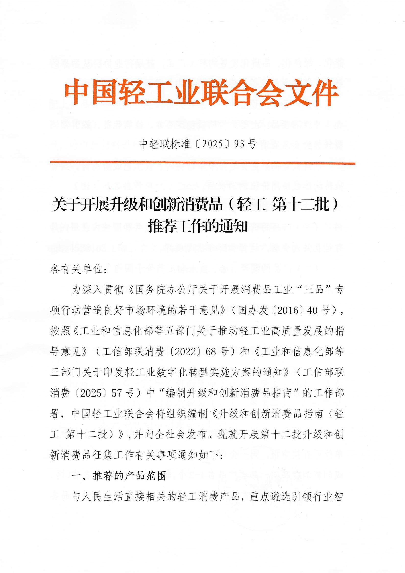 關(guān)于開展升級(jí)和創(chuàng)新消費(fèi)品(輕工第十二批)推薦工作的通知(中輕聯(lián)標(biāo)準(zhǔn)(2025) 93號(hào)).pdf